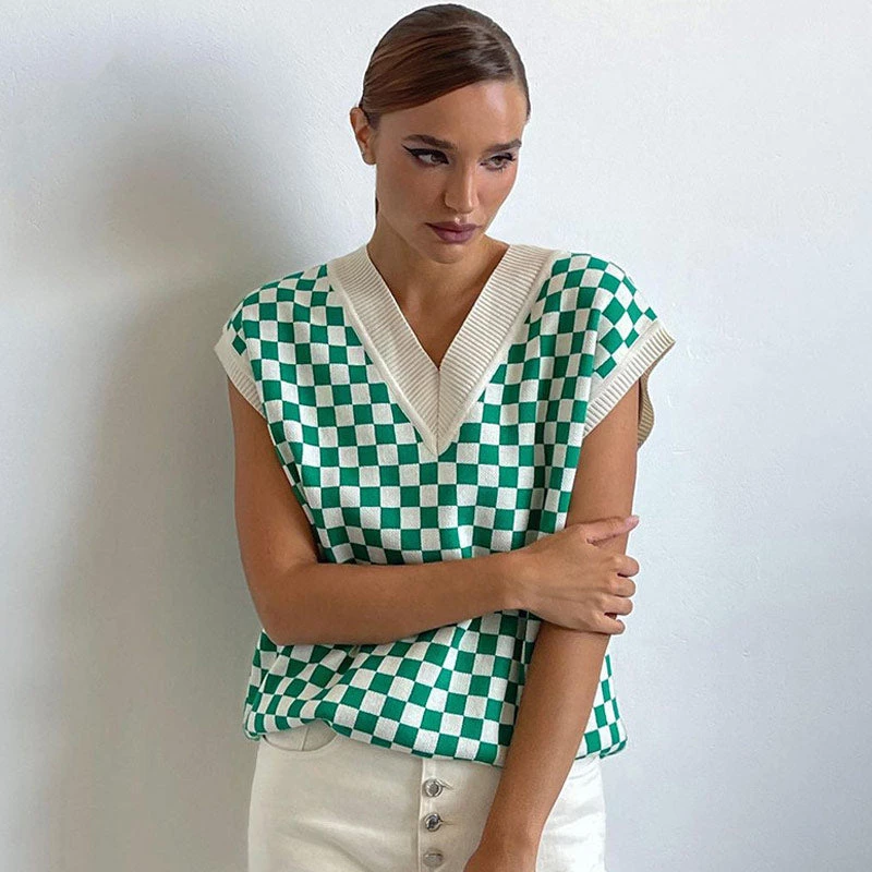 Back to school in this bright-colored knit tank! Made of soft acrylic and polyester fabric, stand out in green and white ginghams throughout, featuring a boxy cut structured with a ribbed plunging neckline and a pullover styling, cap sleeves trimmed with ribbed cuffs, and a regular fit length accented with split sides. Find more trendy women’s sweaters or unique clothing in our boutique, and style it with a pair of white pants and sneakers for a pre-school look.
