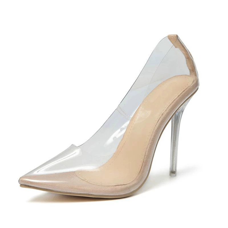 PVC heels just got a cool upgrade and this edge style pair of pumps is an of-the-moment style that feels sophisticated and a little sexy. Crafted with blend PU leather and rubber, stand out in transparent PVC effect with suede stripe at back, featuring a slip-on styling, a pointed toe to the front, lightly cushioned footbed, a glassy-like heel and finished with rubber heel cap. Find more unique women’s pumps and trendy shoes in our boutique, and try them on with chic jeans and maxi dresses or pants to lend a sharp sophistication – Heel height: 11 cm.
