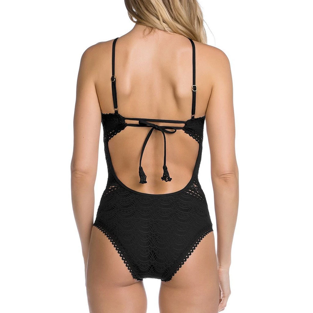 Soak up some sun with this feminine bathing suit. Made from stretchy chinlon and spandex in solid color, embellished with semi-sheer crocheting design at front, featuring a high neckline with adjustable dainty shoulder straps, a sleek silhouette along with scalloped edges, detachable pads at the chest, a sexy open back with a self-tie closure, and the bikini bottom with moderate coverage. Find more trendy women’s one piece swimsuits or unique swimwears in our boutique, and add a floppy hat and kick back and enjoy a day poolside.