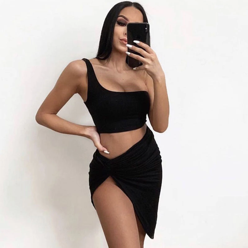 Trendy & Unique What’s New Sexy Cropped One Shoulder High Slit Skirt Matching Set – Black