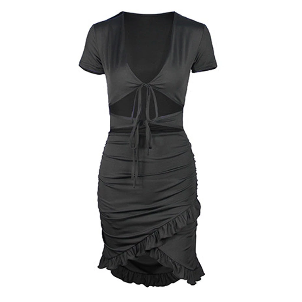 This midriff dress is actually so versatile. Made of super stretchy blend polyester in solid color, embellished with cut-outs along with self-tie closures at the waist, featuring a V neckline tailored with short sleeves, a pullover body-conscious fit trimmed with ruched details, and a mini length accented with an asymmetrical ruffled hem. Find more unique women’s dresses or trendy clothing in our boutique, and team it with thigh high boots for a vintage street look.