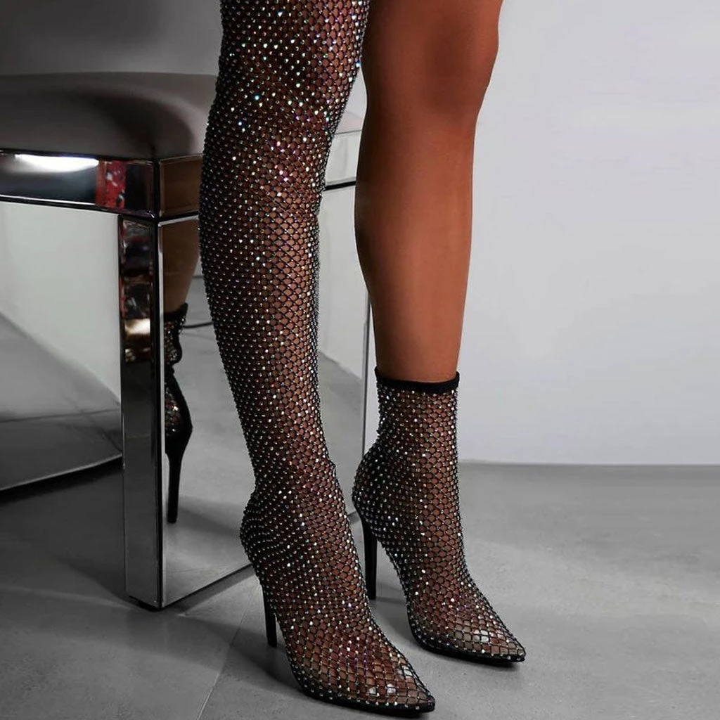 Add a bit of glitter to your ensemble with these ankle boots. Crafted with blend mesh and rubber in solid color, stand out in a glittering see-through profile, featuring an ankle height top line, sharp pointed toes to the front, a zip fastening to the rear, and stiletto heel soles along with rubber heel caps. Find more trendy women’s ankle boots and unique shoes in our boutique, and wear yours with your favorite minidress to channel a stunning party look – Heel height: 9 cm.