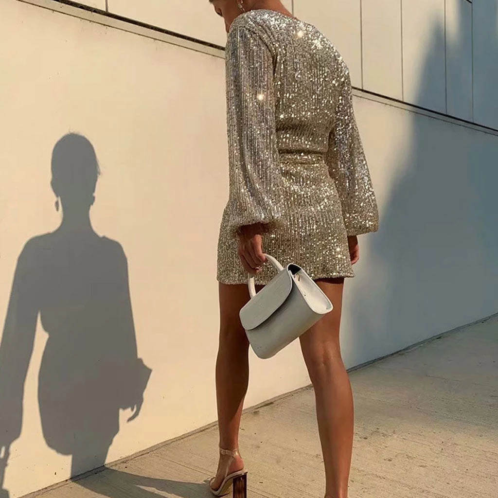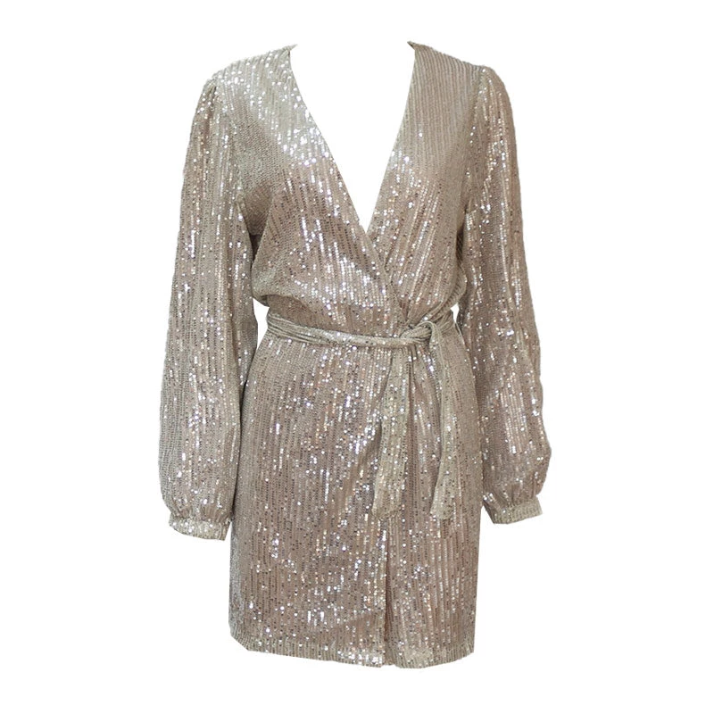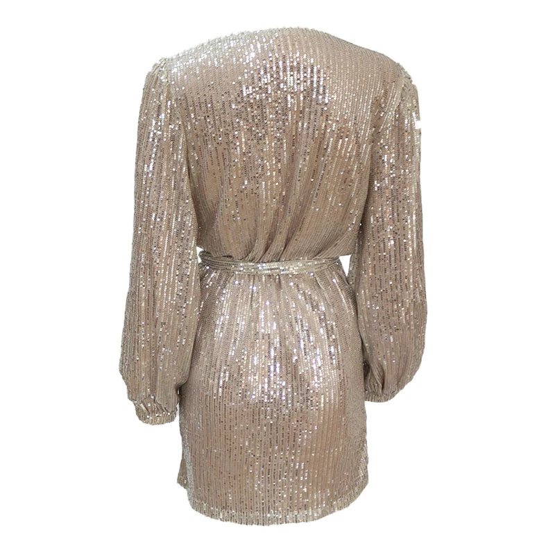 Show off your glam side with this stunning cocktail party dress. Made of polyester fabric, embellished with sparkling sequins, featuring a wrap silhouette along with a self-belt at waist, bishop sleeves tailored with elastic cuffs, a plunging V-shaped neckline at front, and a mini hem. Find more unique women’s sequin dresses or trendy clothing in our boutique, and wear it with a sparkly lariat necklace and white strappy heels for an awesome party look.