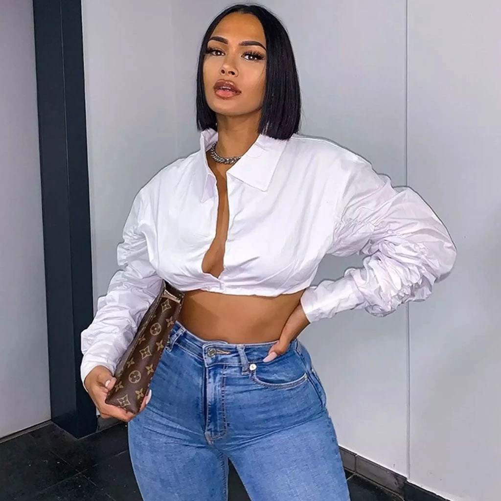 Elevate your going-out look with this fashionable crop button-down. Made of cotton blend and polyester fabric, embellished with gathering details trimmed on the long sleeves, featuring a relaxed fit structured with a point collar and a plunging neckline, and a cropped length accented with a single button to the front and a bare midriff cut at the waist. Find more unique women’s blouses or trendy clothing in our boutique, and style it with your denim, slingback pumps, a shoulder bag and gilded jewelry for unexpected fashion-girl look.