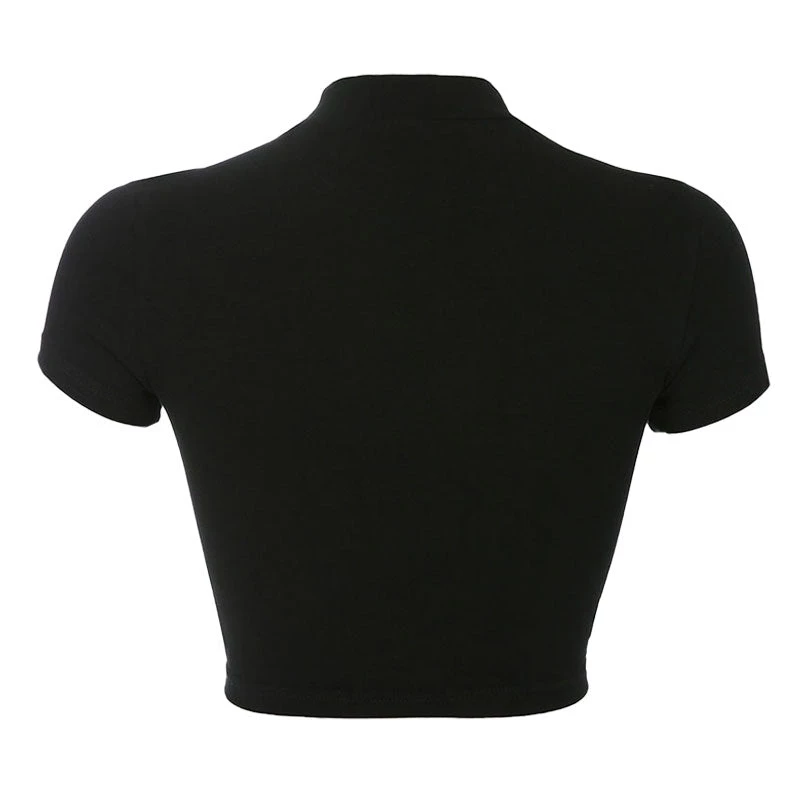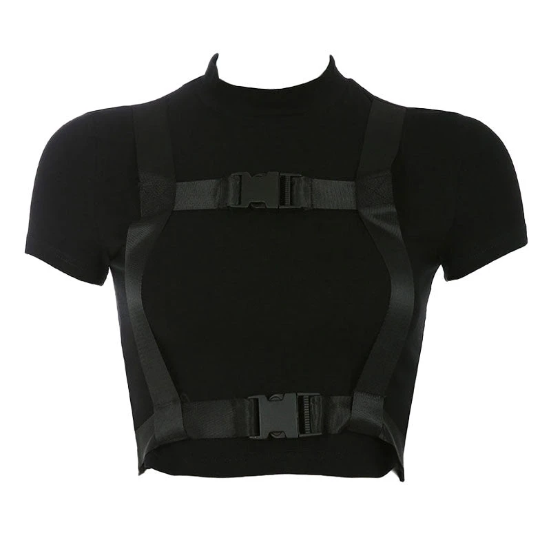 This cropped t-shirt is a cool-girl piece. Made of lightweight polyester fabric, embellished with buckle straps to the front, featuring a pullover slim fit cut structured with a high collar, a short sleeve styling, and a bare midriff cut at the waist. Find more unique women’s crop tops or trendy clothing in our boutique, and pair it with a pair of sunglasses, a pair of leather pants, and combat boots for a chic look.