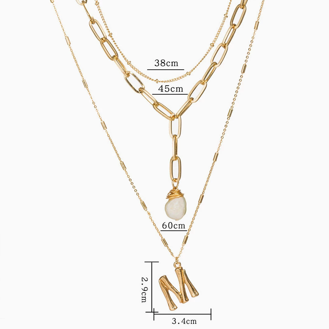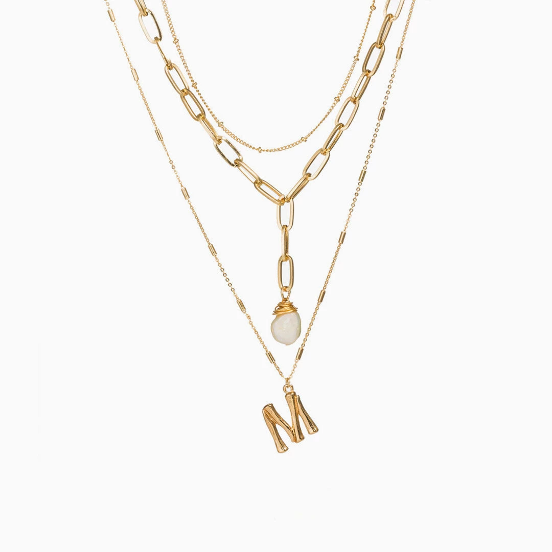This layered necklace is a stand-out addition to your jewelry box. Crafted with gold plated alloy, sand out in a baroque style bead and letter M charms, featuring a treble-strand chain along with an adjustable fit and finished with a spring-ring fastening. Find more trendy women’s necklaces and unique accessory in our boutique, and mix and match with other gold chains for a vintage look.