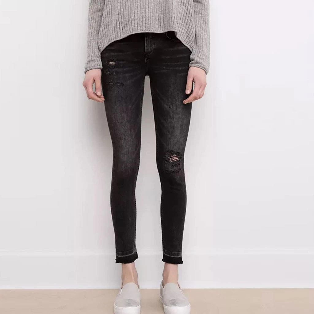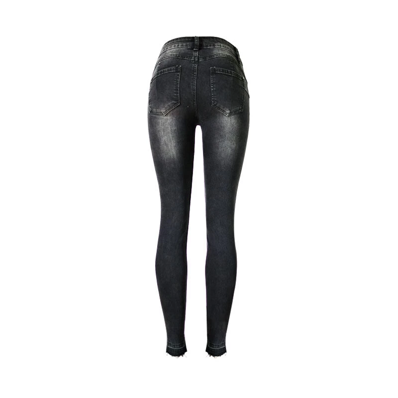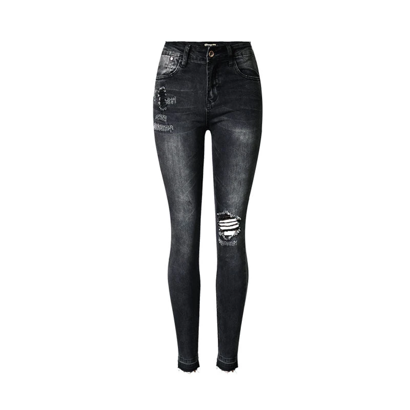 A pair of black jeans is new for winter 2021. Made of stretchy blend denim and polyester, embellished with shredded holes and distressed detailing, featuring a high rise waistband trimmed with belt loops, a button closure along with a concealed zip fastening to the front, classic four pockets, a skinny-leg cut structured with frayed hems. Find more unique women’s jeans or trendy clothing in our boutique, and wear a pair of high heels when go-to.