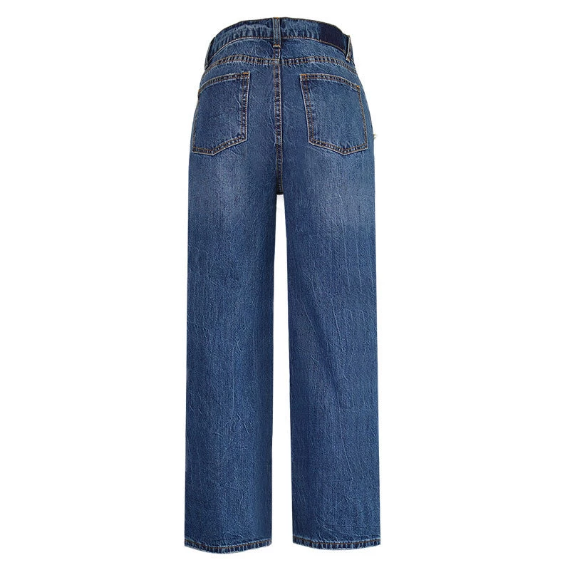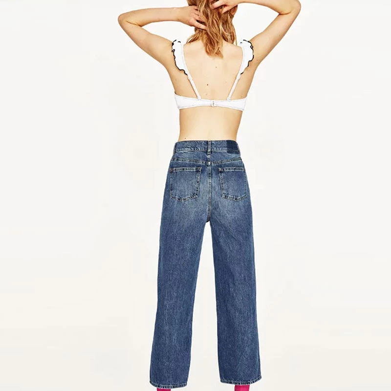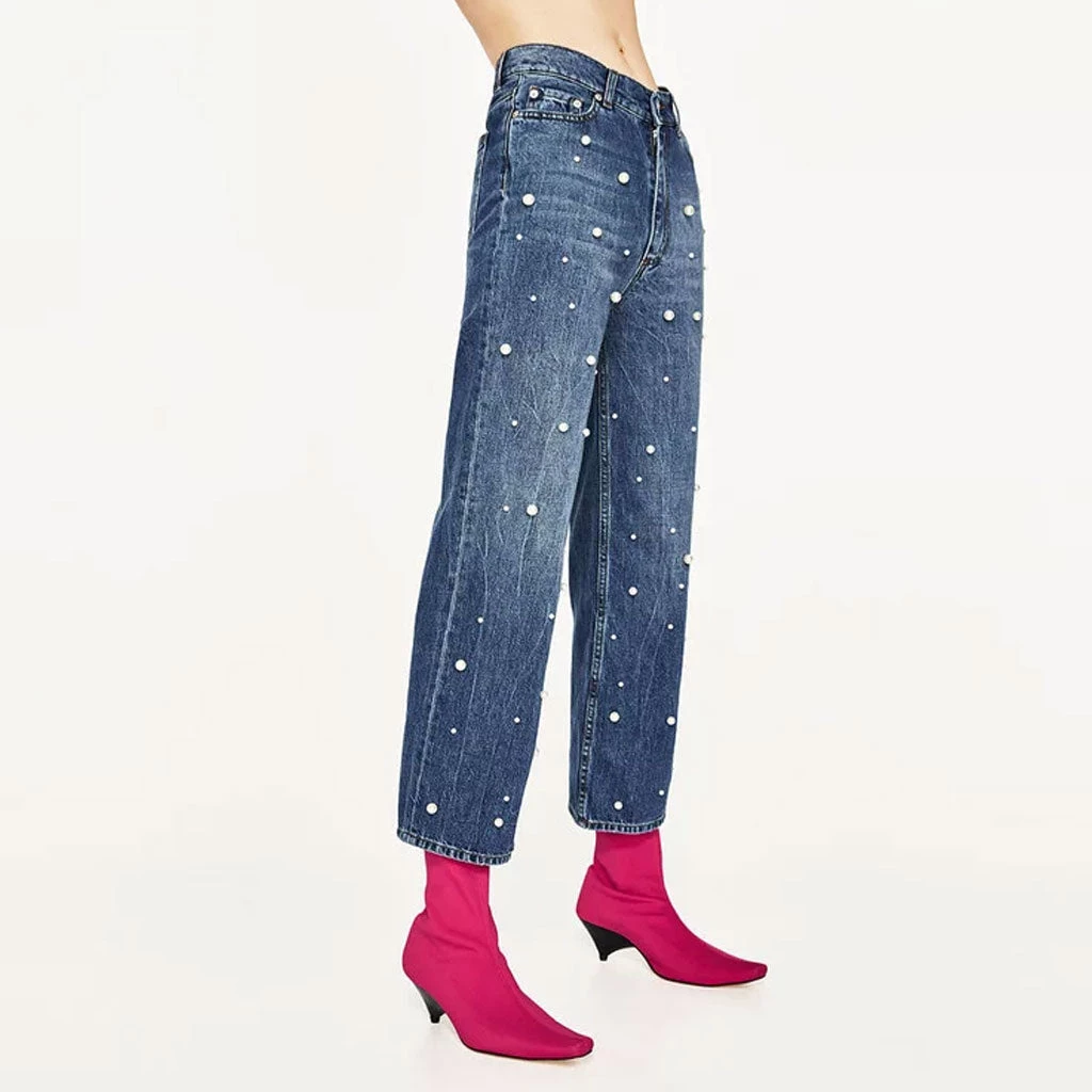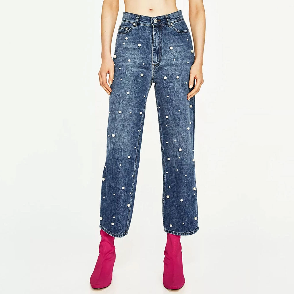 You will be a modern girl with wear this pair of wide jeans. Made of blend denim and polyester, embellished with bright peals trimmed to the front, featuring a high rise waistband trimmed with belt loops, a button closure along with a concealed zip fastening to the front, classic five pockets, a wide-leg cut structured with wide cuffs. Find more trendy women’s jeans or clothing in our boutique, and wear a pair of sandals and a white puff sleeves top to create a unique street look.
