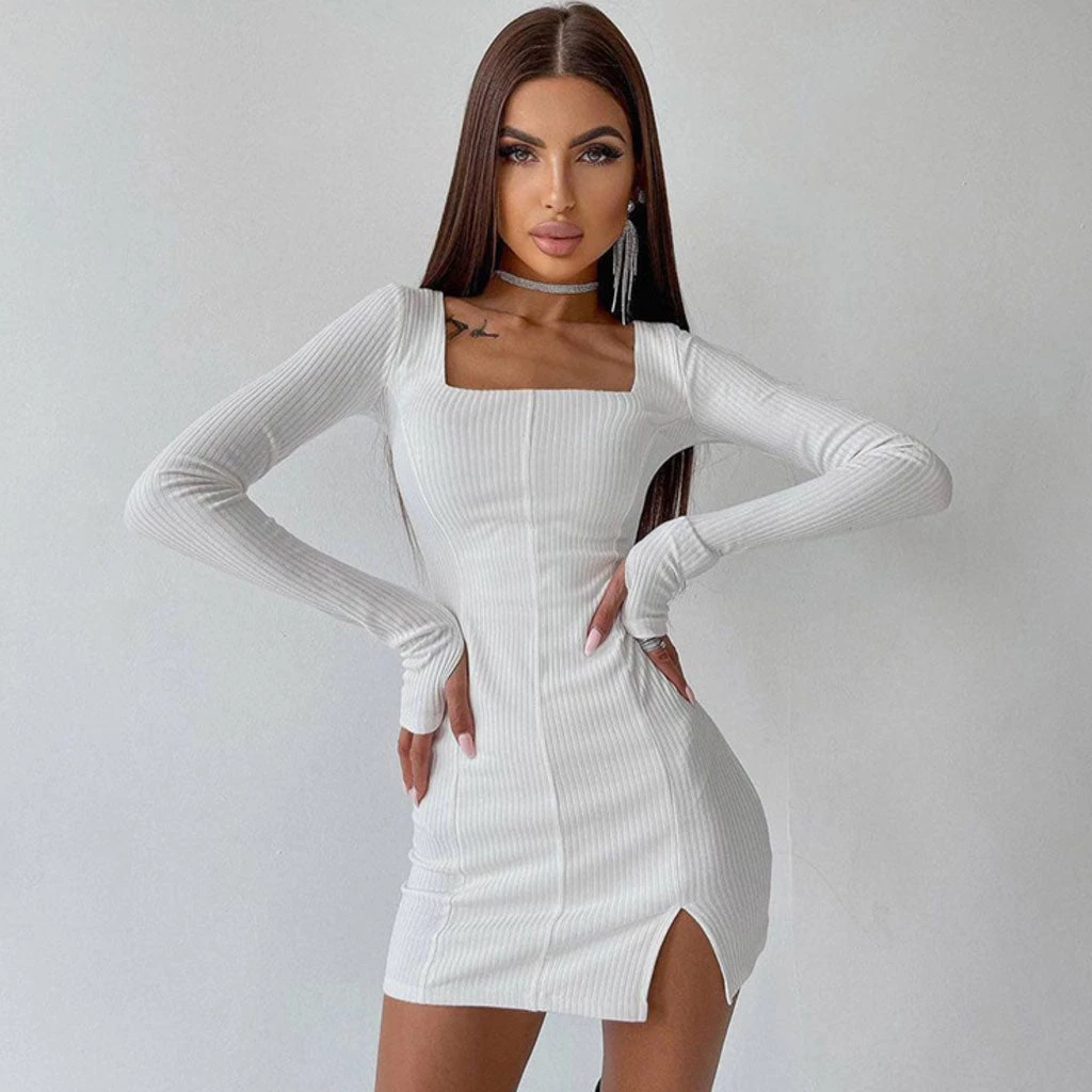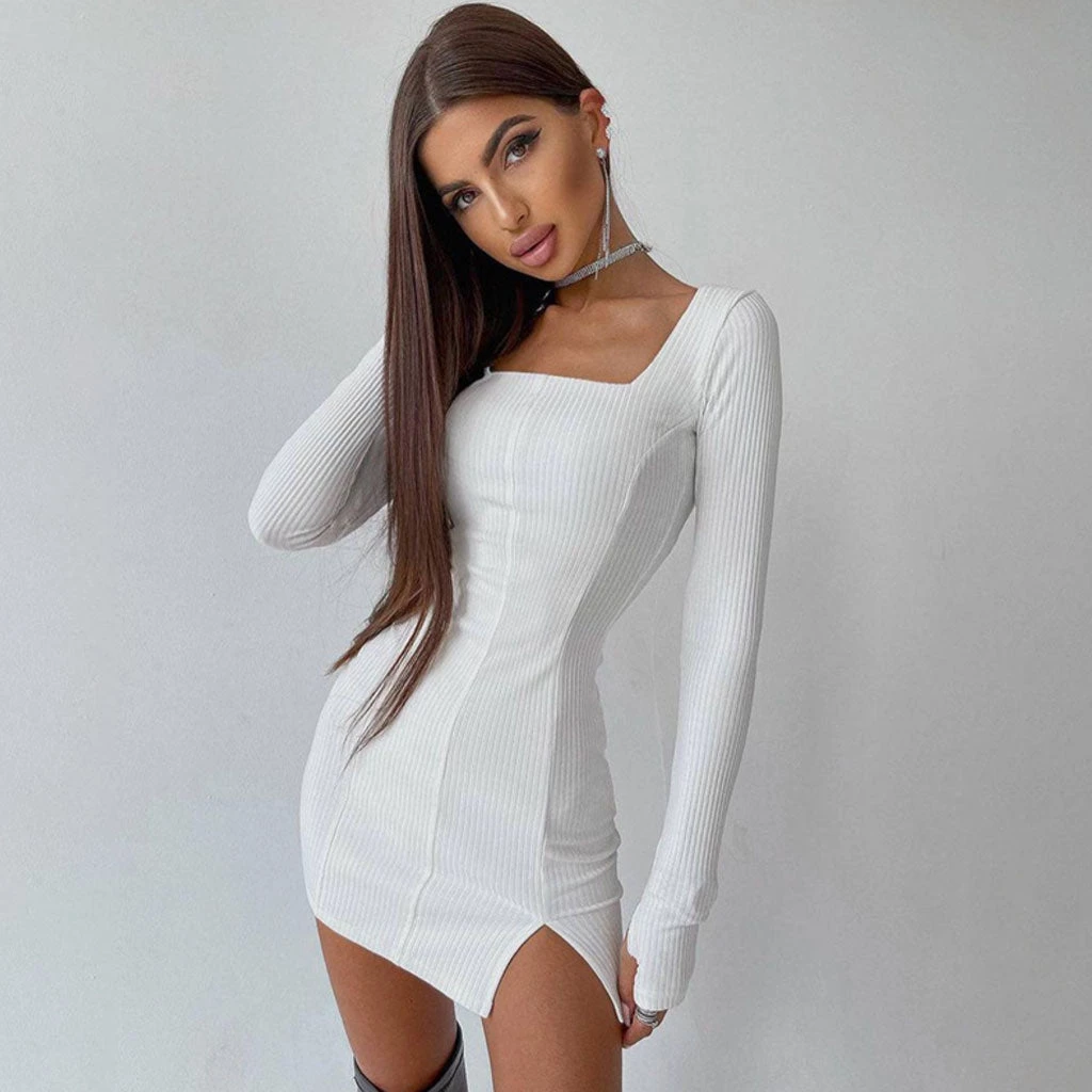 This bodycon knit dress belongs in your closet. Made of soft ribbed jersey and polyester fabric, stand out in a topstitching profile, featuring a square neckline in a pullover design, long sleeves along with thumb holes, and a mini length accented with a side split. Find more unique women’s knit dresses or trendy clothing in our boutique, and wear it with a pair of thigh high heels to finish a modern look.