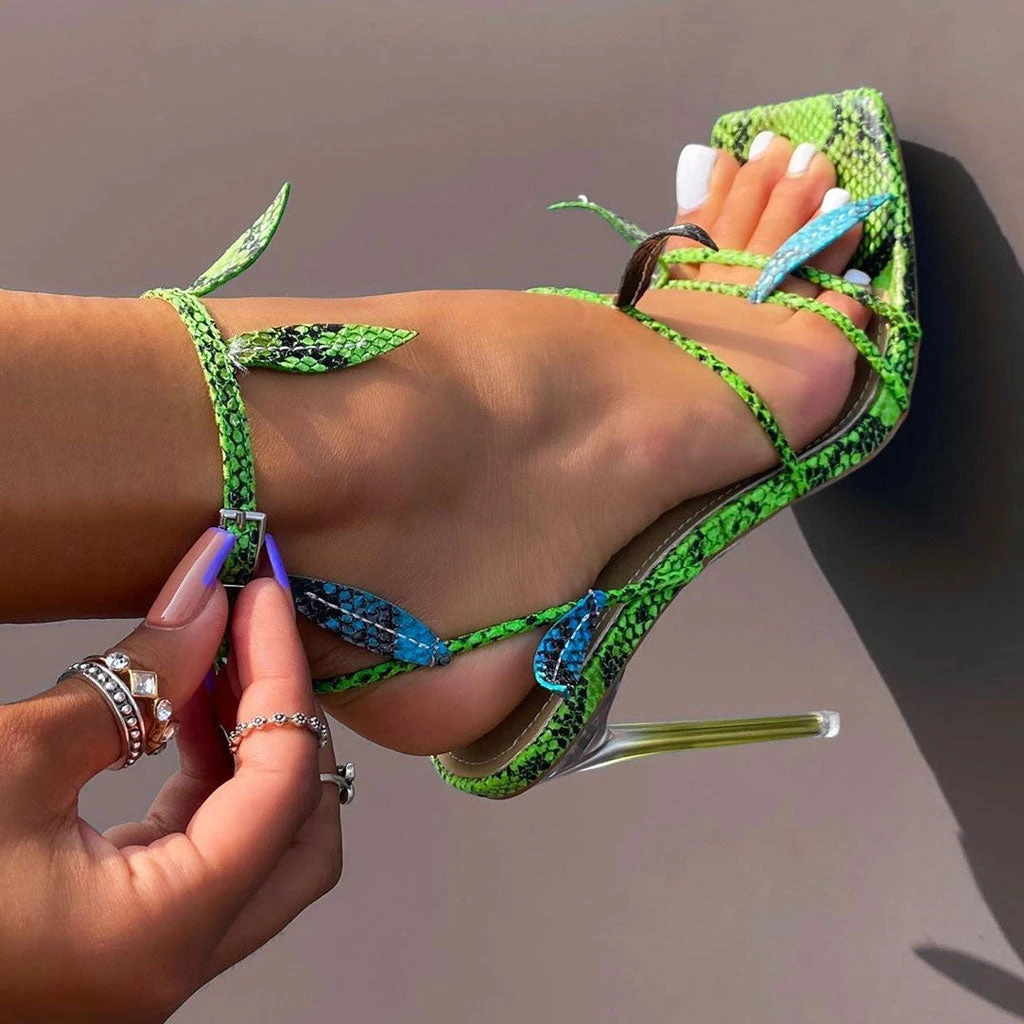 Trendy & Unique What’s New Tropical Leaf Strappy Snake Print Square Toe High Heels – Green