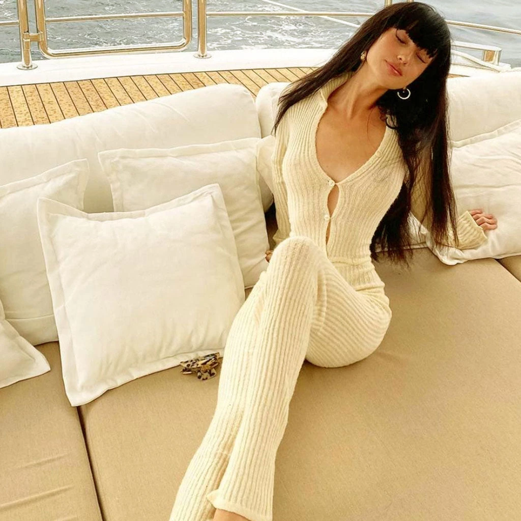 This cozy knitted jumpsuit is perfect for lounging around the house in—and yes, even wear out. Made from soft ribbed jersey and polyester blend in solid color, embellished with a two piece profile, featuring a fold-over collar along with a button placket to the front, long sleeves tailored with thumb holes, a buttoned waistband, and the particularly long length accented with split at sides. Find more trendy women’s matching sets or chic clothing in our boutique, and accessorize with either a pair of heeled sandals or stiletto boots for a unique street look.