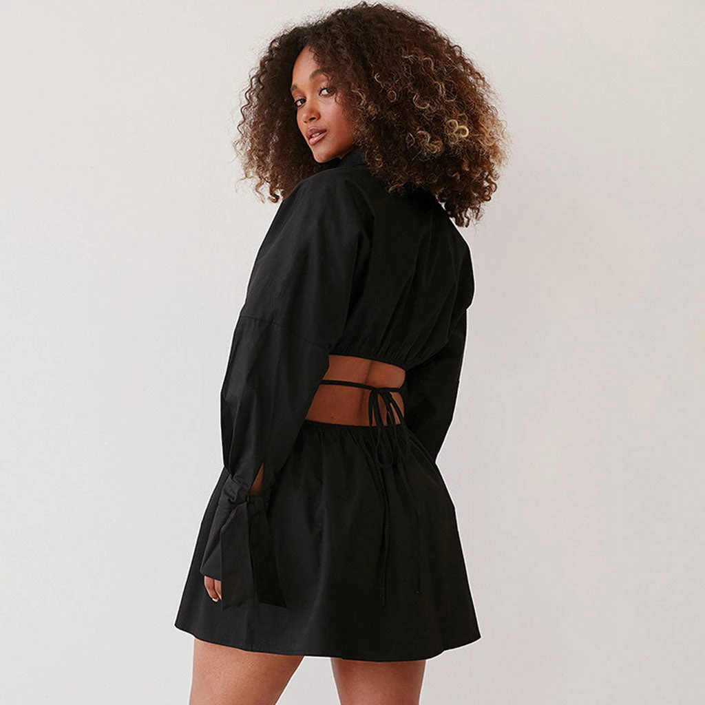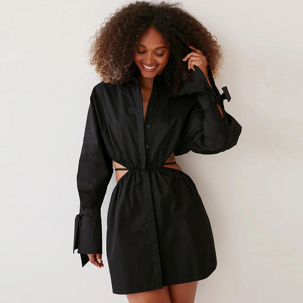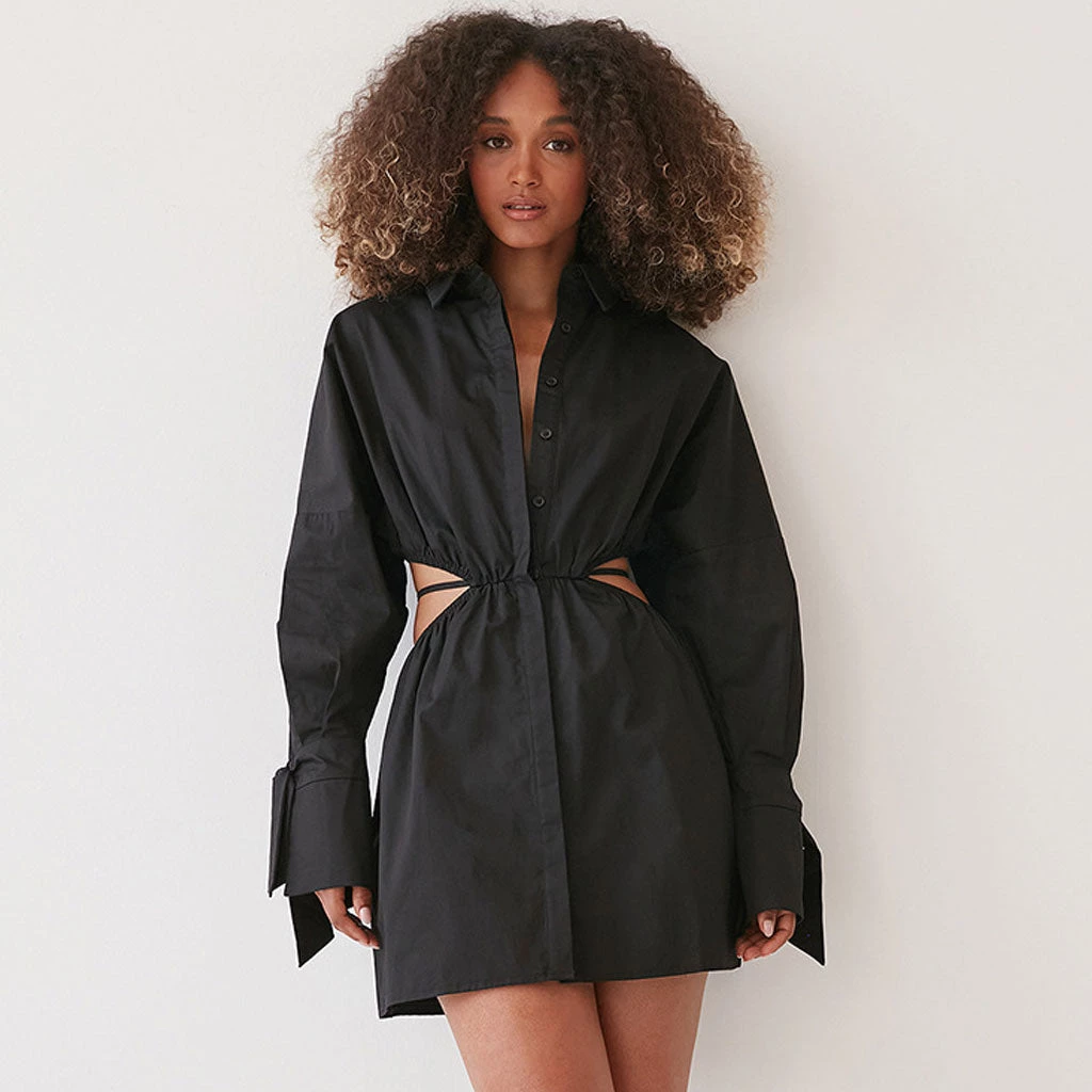 Twist you look with this stylish cutout shirt dress. Crafted with cotton blend and polyester in solid color, embellished with a tied string along with a dramatic cutout at the waist, a fold over collar, a concealed button closure to the front, long sleeves tailored with tied cuffs, and ended up with a mini length. Find more unique women’s shirt dresses or trendy clothing in our boutique, and go for styling with thigh high boots and high heels alike.