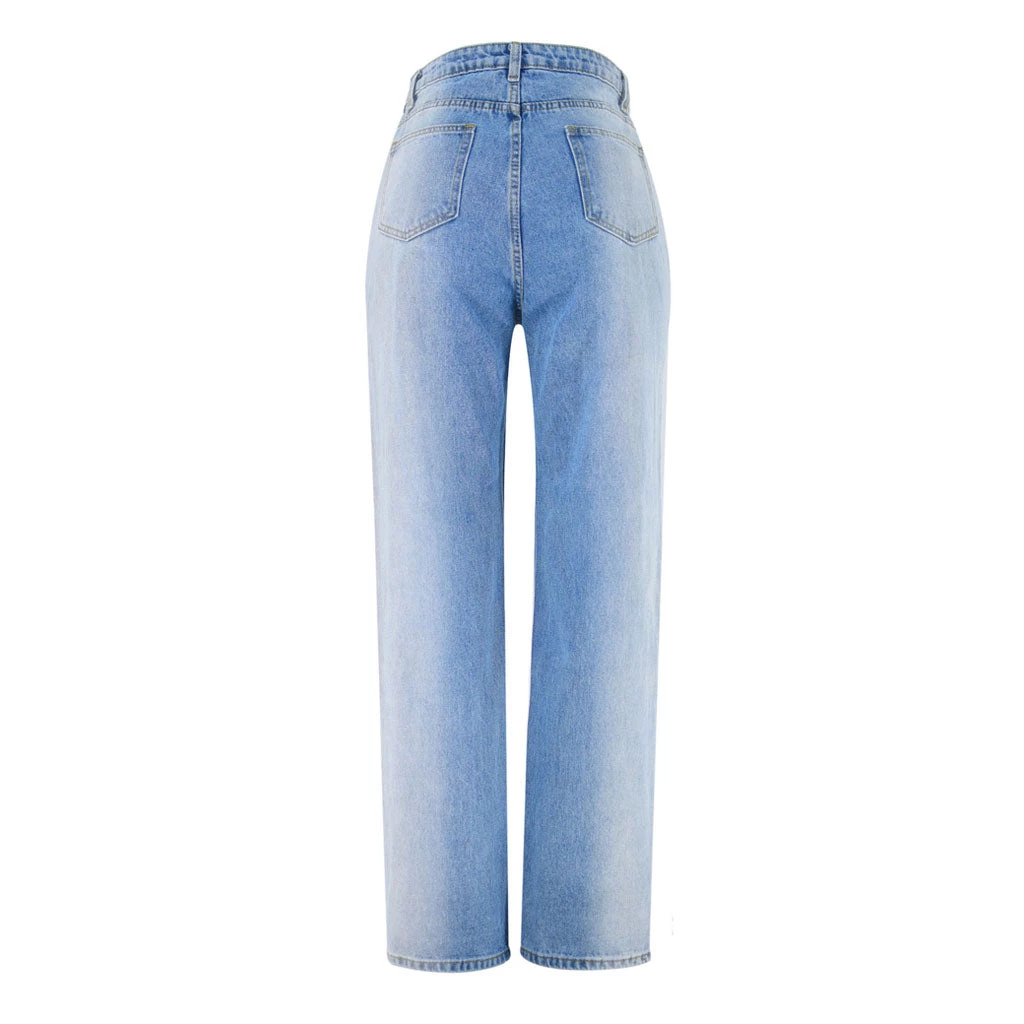 Add this pair of faded jean to your luggage. Made of blend denim and polyester, stand out in a faded profile to one side, featuring a high rise waistband trimmed with belt loops, a button closure along with a concealed zip fastening to the front, classic five pockets, a straight-leg cut structured with the particularly long hems and wide cuffs. Find more trendy women’s jeans or unique clothing in our boutique, and wear a bustier crop tank top, a pair of sneakers and a tote bag to finish a summer look.