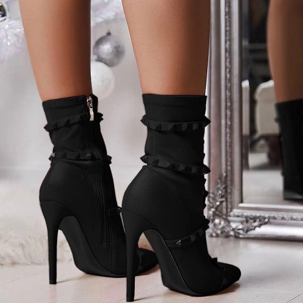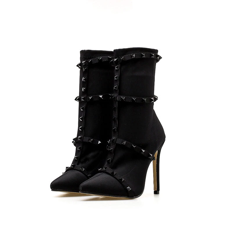 How trendy when you wear this pair of solid color boots. Made of stretchy blend-cotton and rubber, stand out in wrap-around straps trimmed with studs, featuring a calf height silhouette with a slip-on styling, sharp pointed toes to the front, and high heel soles along with rubber heel caps. Find more unique women’s boots and shoes in our boutique, and wear yours with a pair of leather shorts for a street look – Heel height: 11 cm.