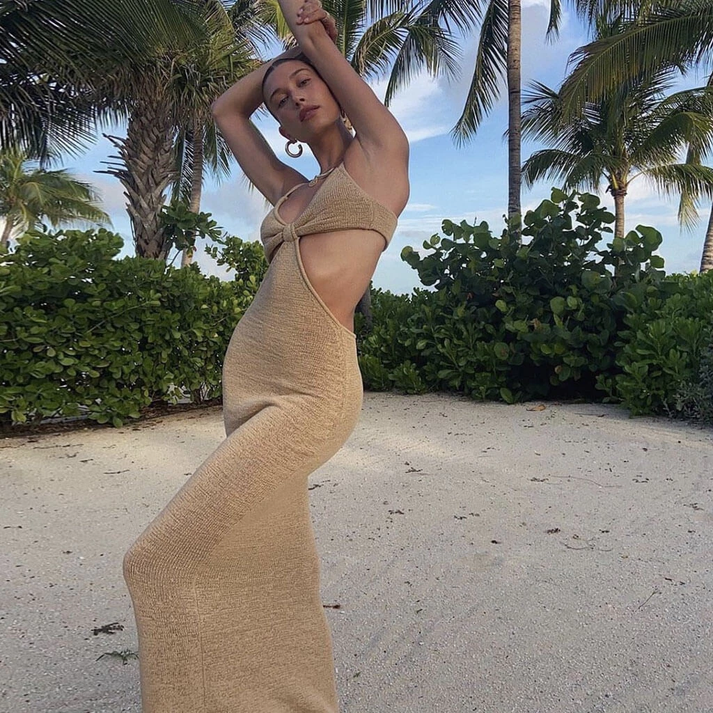 This cozy knit dress is a stunner all year around. Made of soft jersey and polyester in solid color, embellished with a mock-two-piece profile accented with a cut-out at the waist, featuring a crop top styling along with elastic shoulder straps, a bodycon fitting bodice hugging your curves like a glove, and ended up with the particularly long length. Find more unique women’s sweater dresses or trendy clothing in our boutique, and go for a tote bag and slides for a free-spirit beach vacation look.