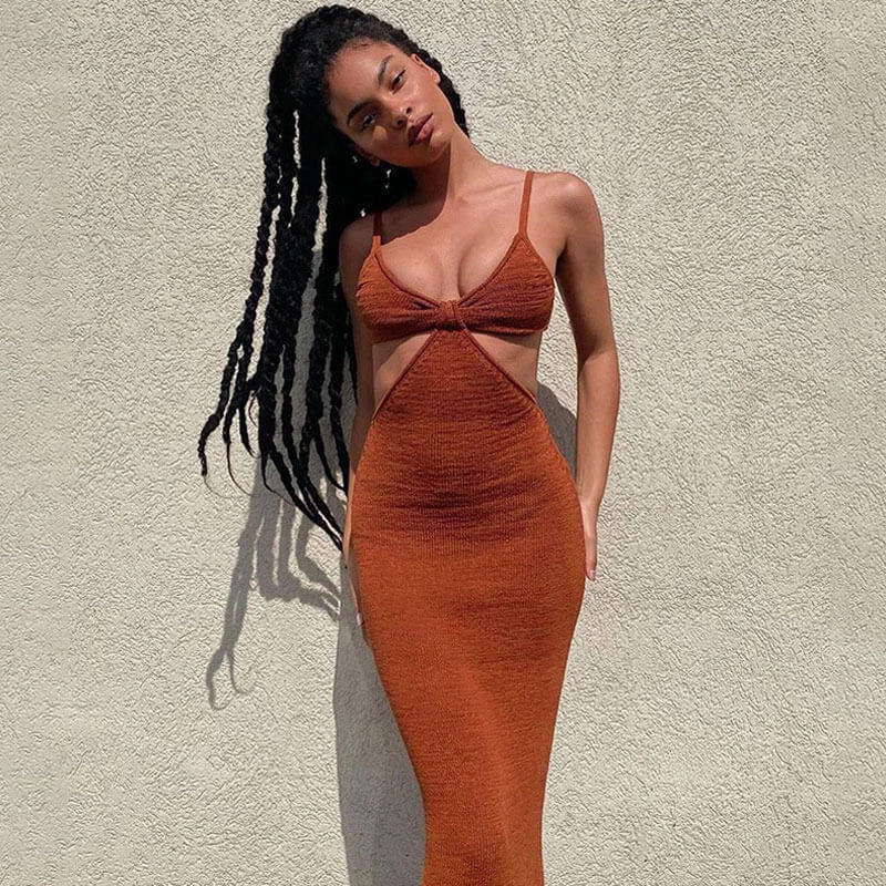 Trendy & Unique What’s New Vacation Ready Deep V Neck Cut Out Sweater Maxi Dress – Rust
