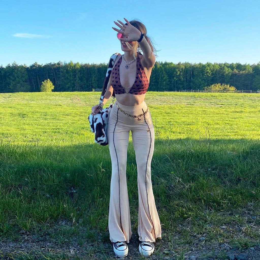If you need a retro flared moment, wear this pair. Made of blend cotton and polyester, embellished with contrasting lettuce seams, featuring a fit-and-flare cut structured with a covered elastic high-rise waistband and the particularly long hems. Find more trendy women’s pants or unique clothing in our boutique, and style it with everything for a retro-inspired look.