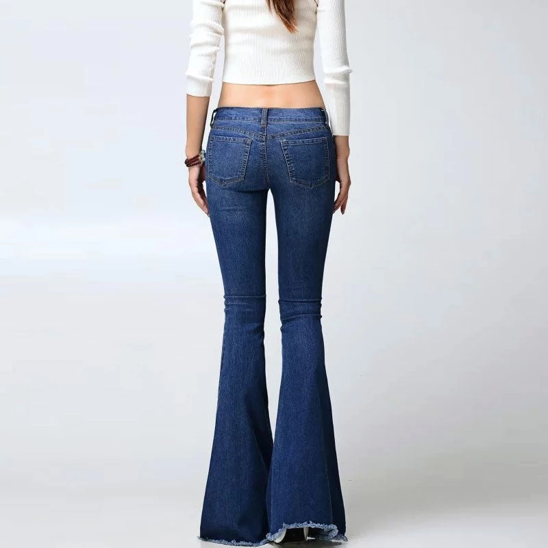 This pair of Jeans is simple and just a little vintage inspired. Made from slightly stretchy denim blend, stand out in a contrast fading blue profile, featuring a high waisted with belt loops, a one-button with a concealed zip fastening at front, classic five pockets, a fit-and-flare cut structured with the particularly long wide hems and frayed edges. Find more unique women’s jeans or clothing in our boutique, and tuck in your tee and add a pair of chic Heels for a retro-inspired street look.