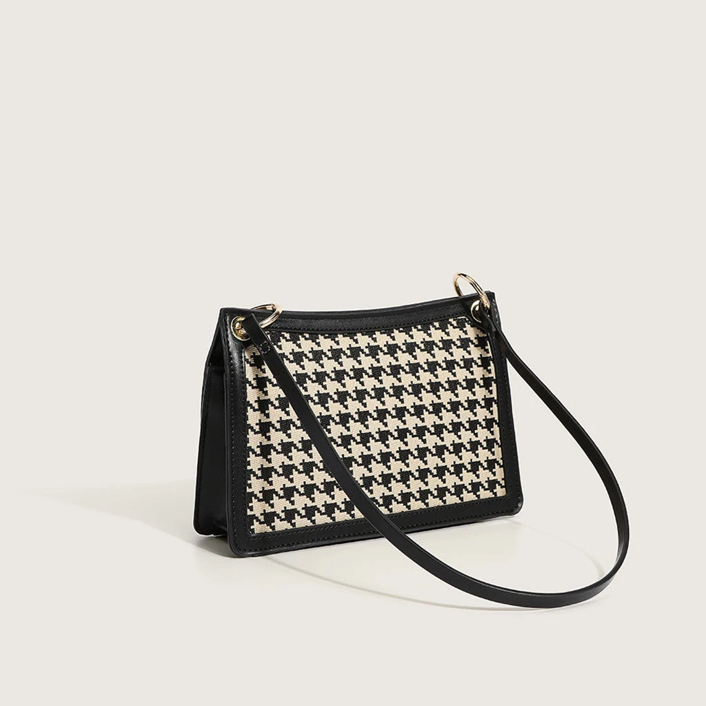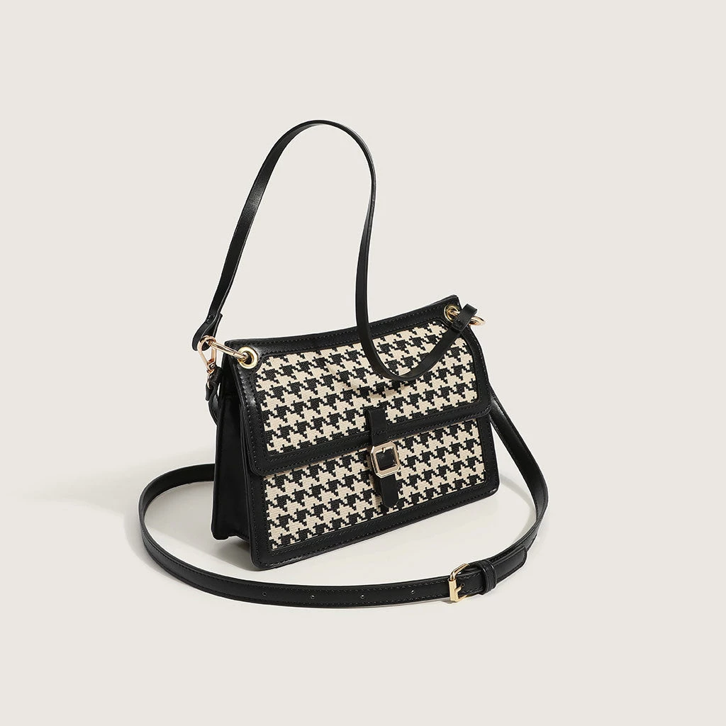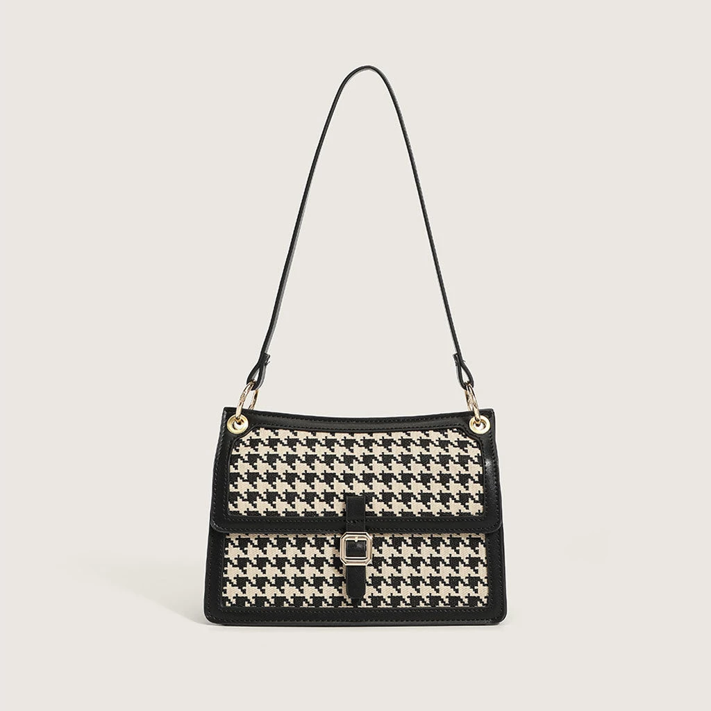This shoulder bag has a classic shape and eye-catching detail. Made from PU leather, blend cotton and canvas, stand out in a black and white houndstooth print overlay, featuring a structured silhouette with a magnetic buckle flap closure to the front, a detachable shoulder strap to the top. Find more trendy women’s shoulder bags or unique bags in our boutique, and elevate your office look with our chic accessories.