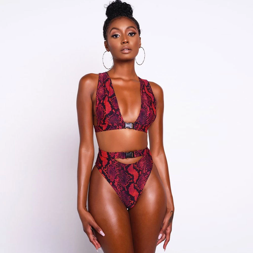 Get ready to wow everyone with this cool two-piece swimsuit. Made of stretchy nylon and spandex in snakeskin print, embellished with a buckles closure to the front, featuring a triangle swim top along with removable pads, wide shoulder straps along with an elastic band to the rear, complete a trendy beach look with a pair of cheeky back coverage thong bottom distinguished with a high rise design and a cut-out detail. Find more women’s bikini sets or unique boutique swimwear to bask in the sun.