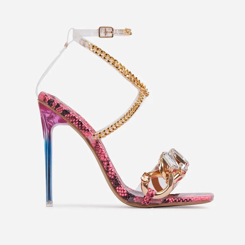Trendy & Unique What’s New Wild Style Snake Print Gem Trim Chain Strap High Heels – Red